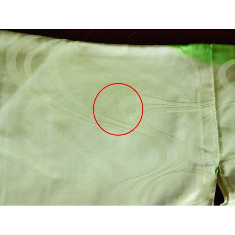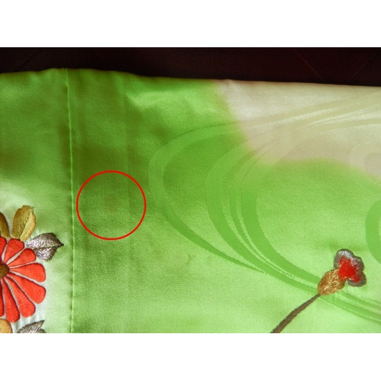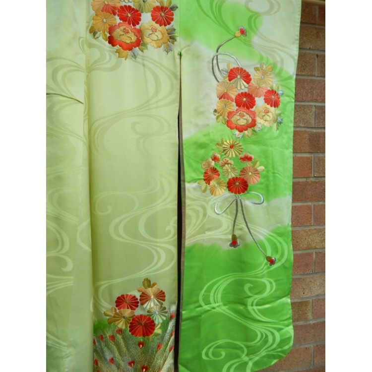 Women's furisode (long-sleeved) kimono. Beautiful light green coloured soft and shiny synthetic material, embroidered with peacock and flower designs.