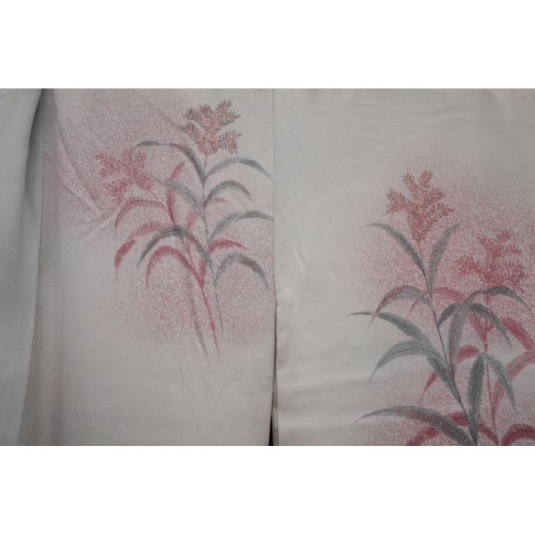 Antique Japanese pale pink silk kimono with flowering grasses design.