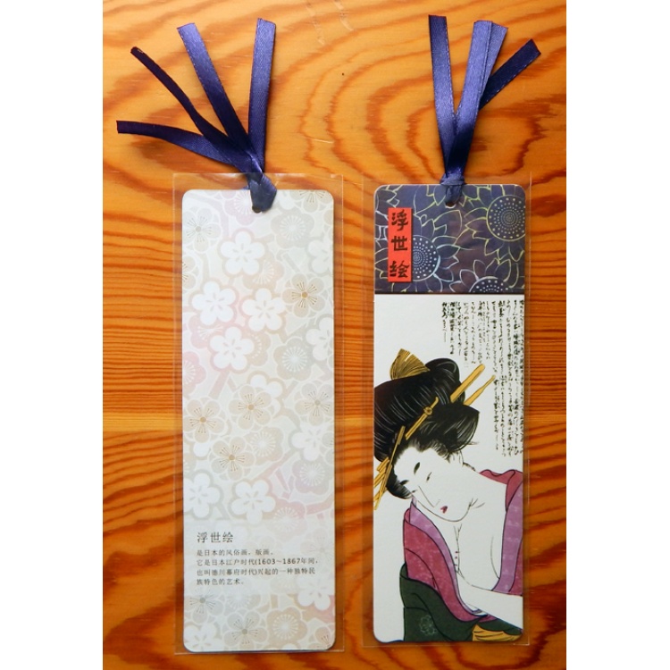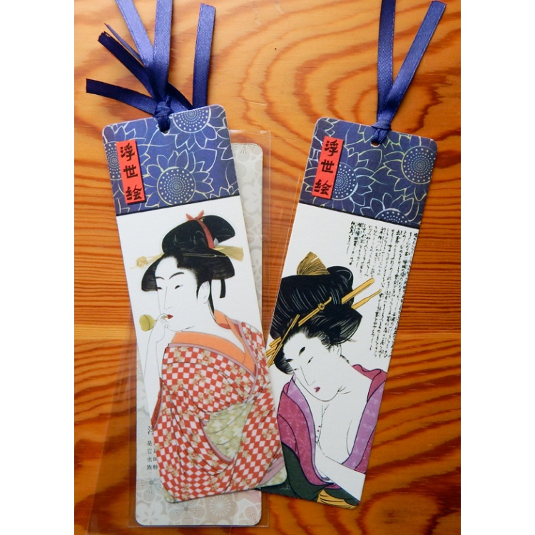 Set of bookmarks featuring traditional Japanese Ukiyo-e prints of women.Two bookmarks, one of each design.With dark blue ribbon. Flower patterned back.Size: 17cm x 5.5cm