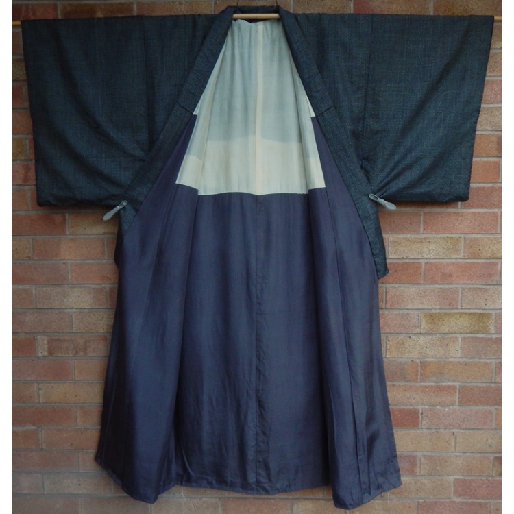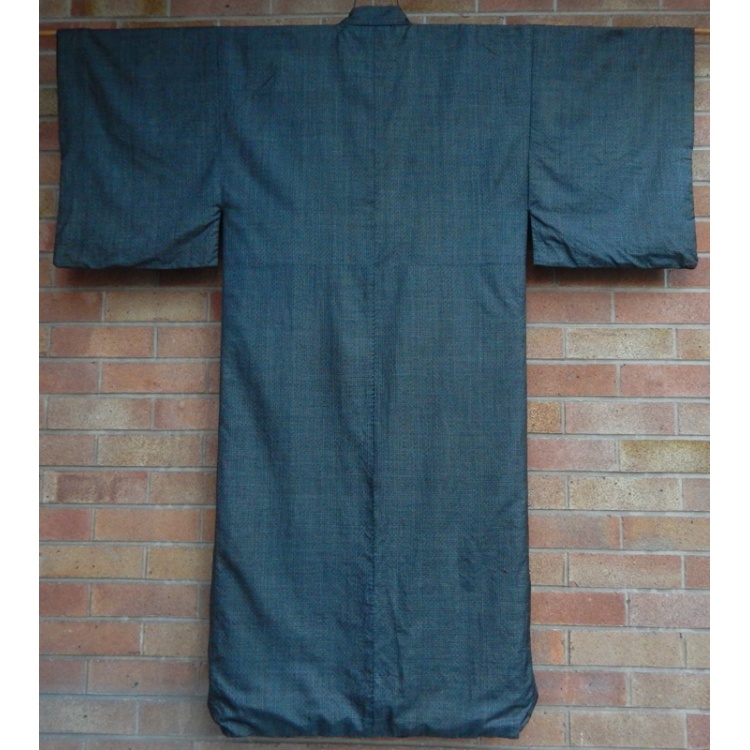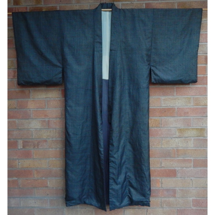 Men's antique doro oshima tsumugi silk kimono. Dark blue lightweight patterned silk with a lovely drape.