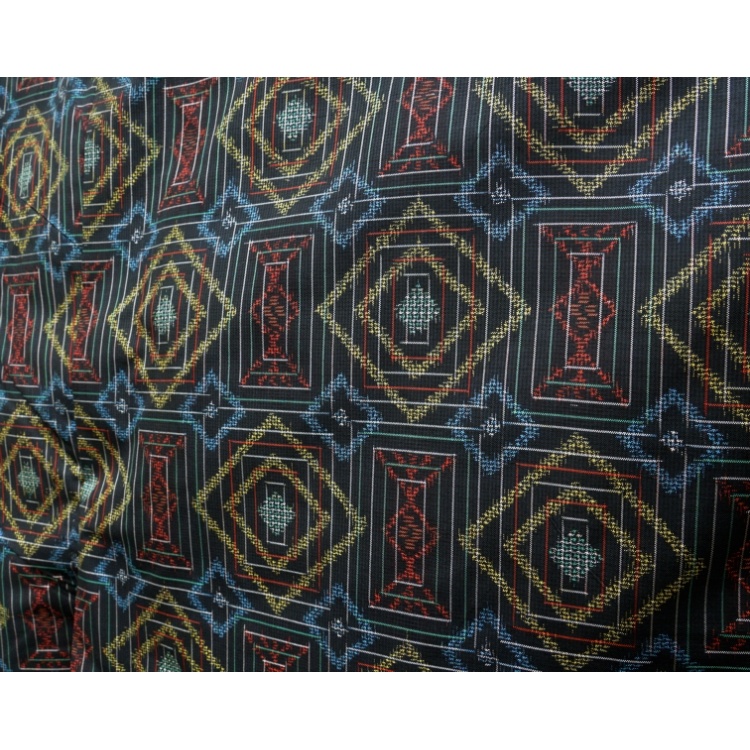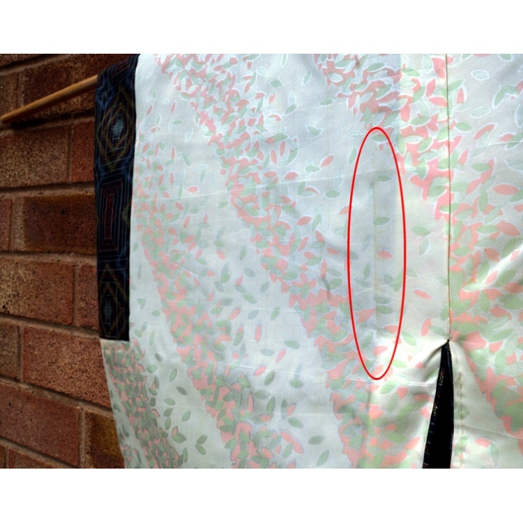 Women's haori jacket. Black oshima-tsumugi silk with blue, red and yellow designs. Lining - white silk with pink and green leaves design.