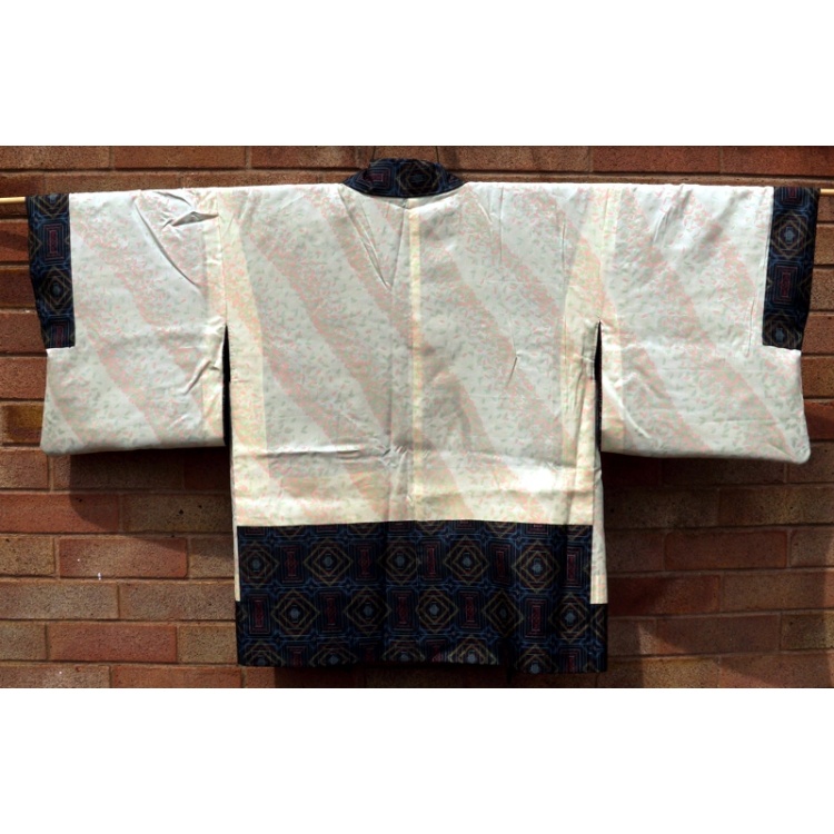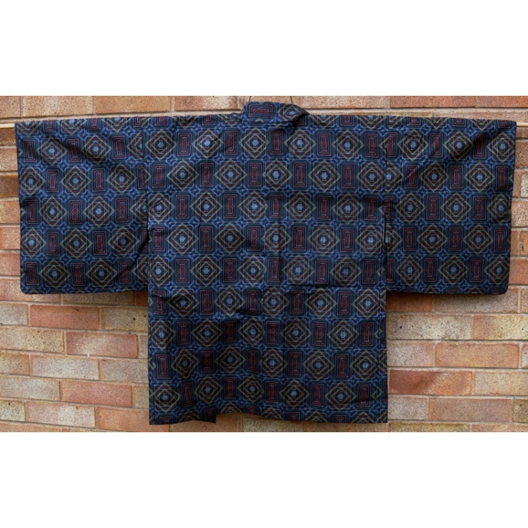 Vintage Japanese oshima-tsumugi silk women's haori with diamond pattern.