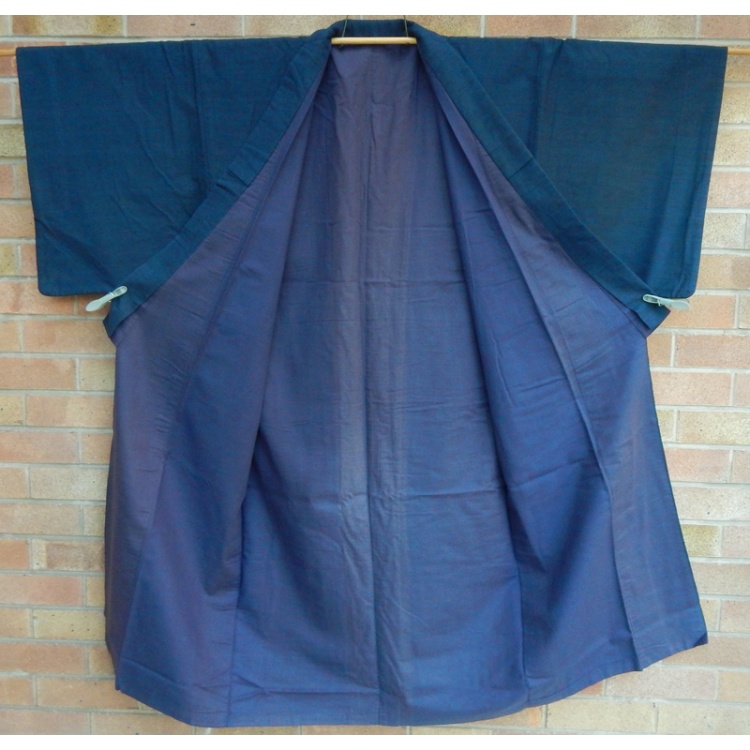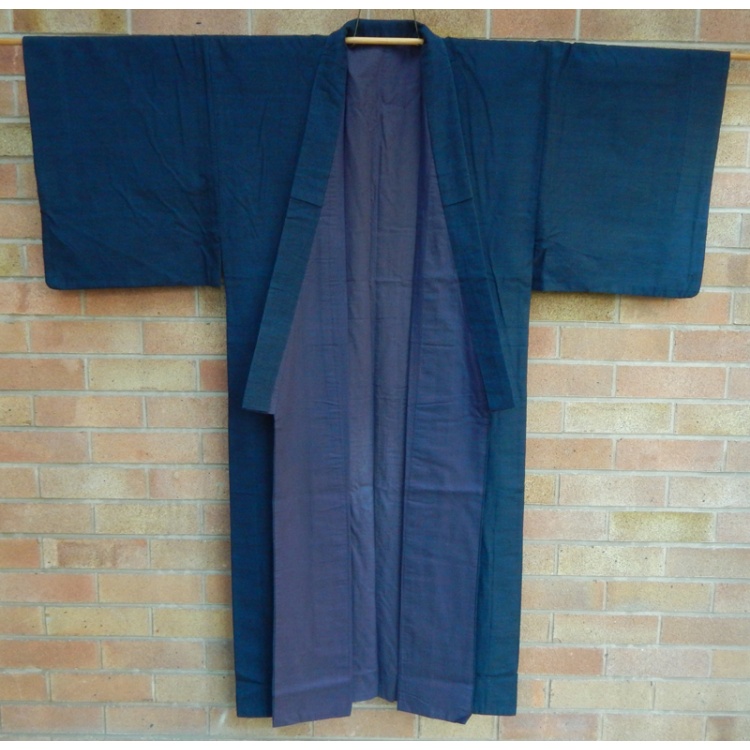 Men's vintage silk kimono. Dark blue tsumugi silk with plain dark bluish purple lining.