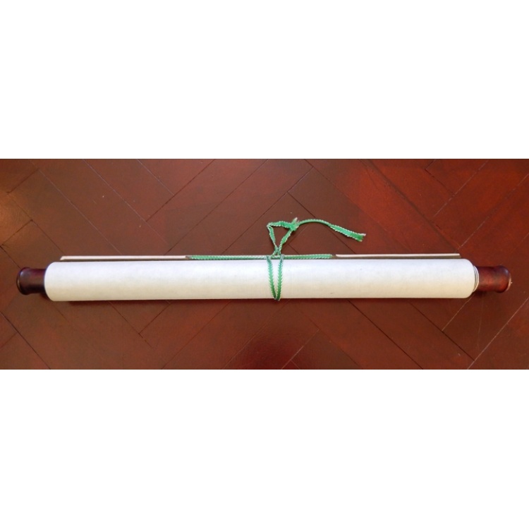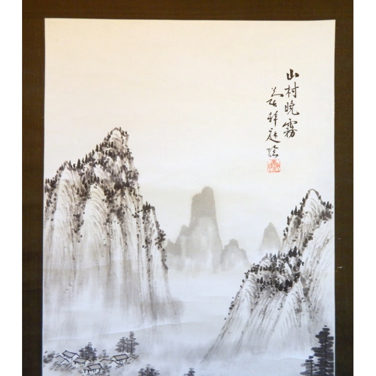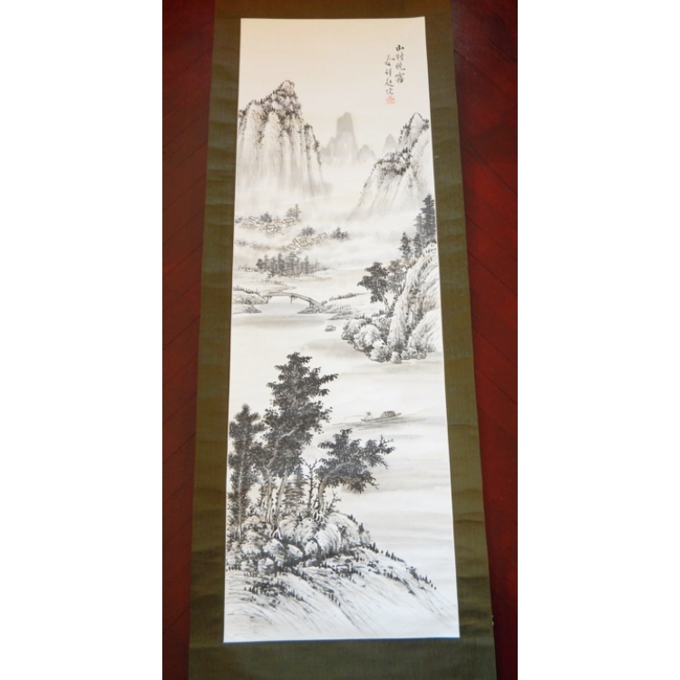 Vintage Japanese wall hanging scroll with hand-painted landscape.